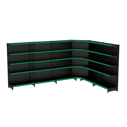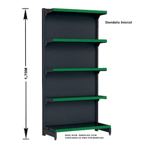 GONDOLA PAREDE 170 FIT AMAPÁ PARA VÃO DE ATÉ 5 METROS MAIS UM CANTO 40/30 PRETO 30 BANDEJAS PORTA ETIQUETA VERDE