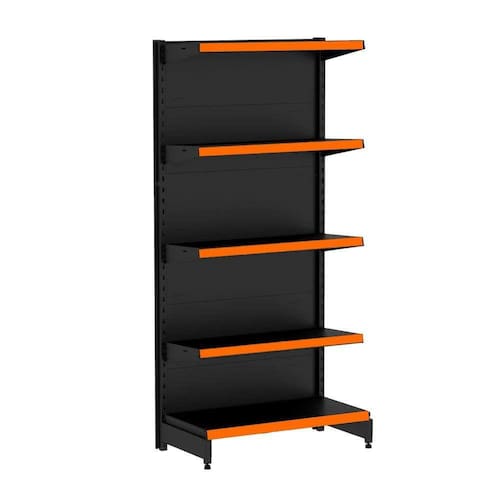 GÔNDOLA PAREDE 196 INICIAL AMAPÁ LINHA PREMIUM FLEX 60 EXTRA FORTE 5 BANDEJAS 1X 40 CM 4X 35 CM COR PRETO PORTA ETIQUETA (FAIXA) LARANJA