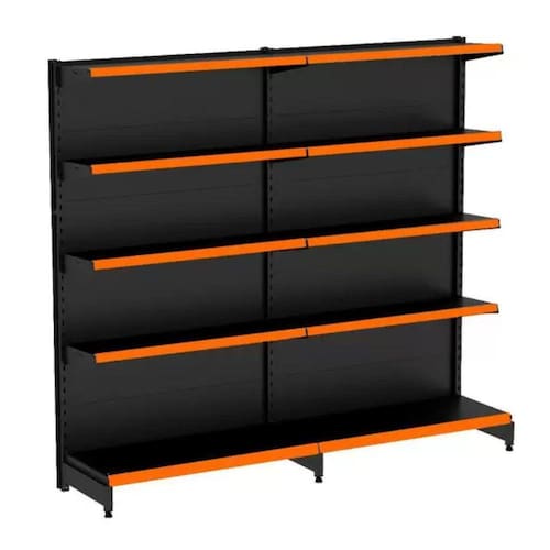 GONDOLA PAREDE 196 AMAPÁ FLEX 60 EXTRA-FORTE KIT 2 METROS 5 BANDEJAS 1X40 CM +4X 35 CM PRETO PORTA ETIQUETA (FAIXA) LARANJA A Gôndola Premium Flex 60 Parede EXTRA FORTE é ideal para seguimentos ou pessoas exigentes, que necessita de uma gôndola mais robusta ou maior capacidade de armazenamento, pois a capacidade por bandeja é de 60 kg distribuído. Indicado para supermercados, mercearias, pet shop, materiais de construção, agropecuárias e outros. Prática e fácil de montar, com sistema de encaixe sem utilização de parafusos, possui bandejas reguláveis a cada 4,5 cm, pés com regulagem de altura, colunas dupladas e tratamento especial da superfície.
