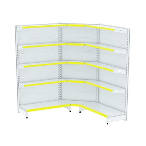 GONDOLA PAREDE 196 AMAPÁ FLEX 60 EXTRA-FORTE KIT 2 METROS COM 1 CANTO 5 BANDEJAS 1X40 CM +4X 35 CM BRANCO PORTA ETIQUETA (FAIXA) AMARELO