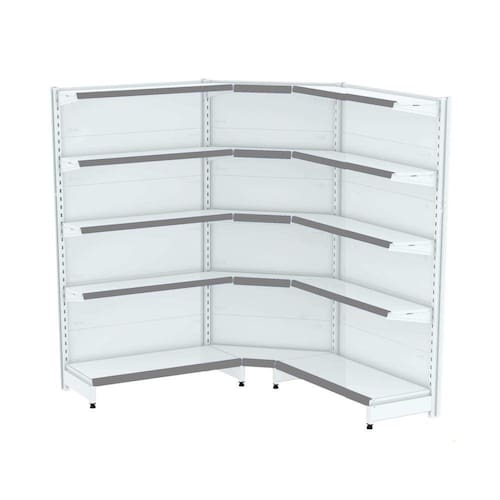GONDOLA PAREDE 196 AMAPÁ FLEX 60 EXTRA-FORTE KIT 2 METROS COM 1 CANTO 5 BANDEJAS 1X40 CM +4X 35 CM BRANCO PORTA ETIQUETA (FAIXA) CINZA