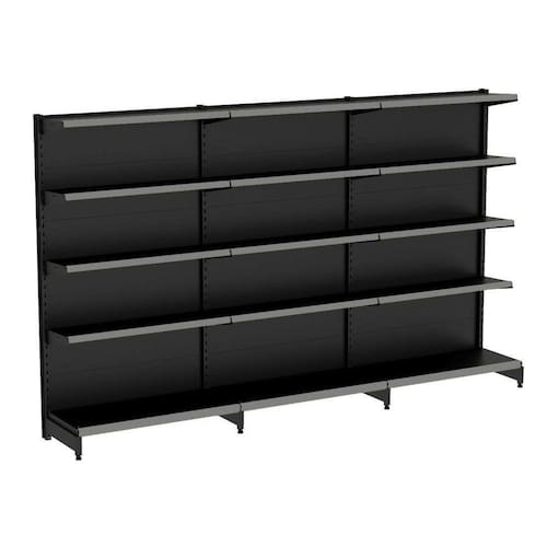 GONDOLA PAREDE 196 AMAPÁ FLEX 60 EXTRA-FORTE KIT 3 METROS 5 BANDEJAS 1X40 CM +4X 35 CM PRETO PORTA ETIQUETA (FAIXA) CINZA