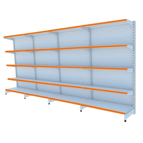 GONDOLA PAREDE 196 AMAPÁ FLEX 60 EXTRA-FORTE KIT 4 METROS 5 BANDEJAS 1X40 CM +4X 35 CM BRANCO PORTA ETIQUETA (FAIXA) LARANJA