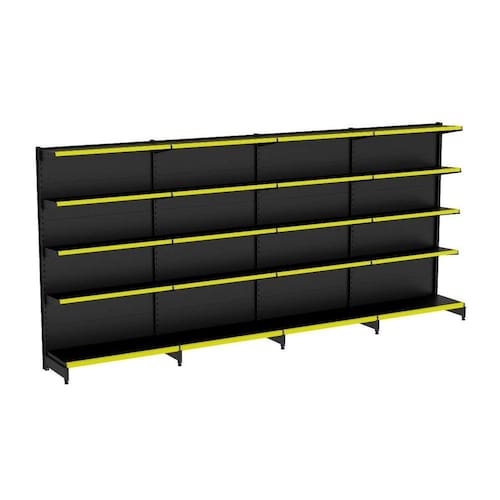 GONDOLA PAREDE 196 AMAPÁ FLEX 60 EXTRA-FORTE KIT 4 METROS 5 BANDEJAS 1X40 CM +4X 35 CM PRETO PORTA ETIQUETA (FAIXA) AMARELO