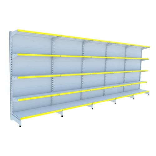 GONDOLA PAREDE 196 AMAPÁ FLEX 60 EXTRA-FORTE KIT 5 METROS 5 BANDEJAS 1X40 CM +4X 35 CM BRANCO PORTA ETIQUETA (FAIXA) AMARELO