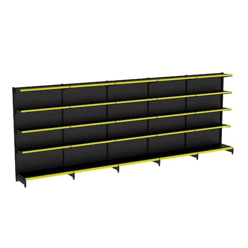 GONDOLA PAREDE 196 AMAPÁ FLEX 60 EXTRA-FORTE KIT 5 METROS 5 BANDEJAS 1X40 CM +4X 35 CM PRETO PORTA ETIQUETA (FAIXA) AMARELO