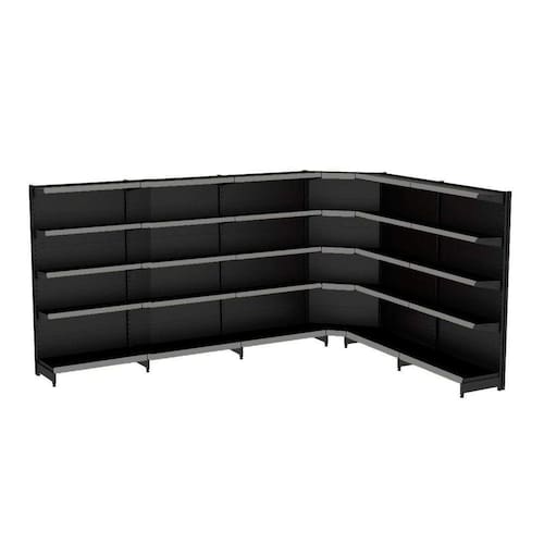 GONDOLA PAREDE 196 AMAPÁ FLEX 60 EXTRA-FORTE KIT 5 METROS COM 1 CANTO 5 BANDEJAS 1X40 CM +4X 35 CM PRETO PORTA ETIQUETA (FAIXA) CINZA