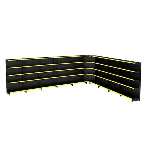 GONDOLA PAREDE 196 AMAPÁ FLEX KIT 9 METROS COM 1 CANTO 40/30 PRETO PORTA ETIQUETA AMARELO