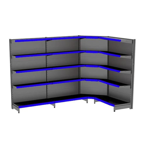 GONDOLA PAREDE 202 FIT AMAPÁ PARA VÃO DE ATÉ 3 METROS MAIS UM CANTO 40/30 PRETO 20 BANDEJAS PORTA ETIQUETA AZUL