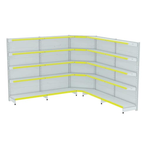 GONDOLA PAREDE 202 FIT AMAPÁ PARA VÃO DE ATÉ 4 METROS MAIS UM CANTO 40/30 BRANCO 25 BANDEJAS PORTA ETIQUETA AMARELO