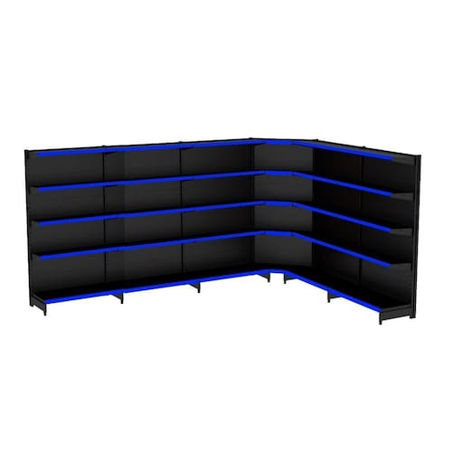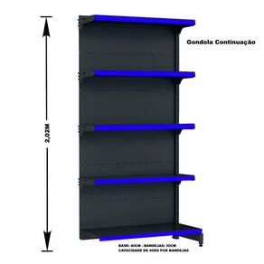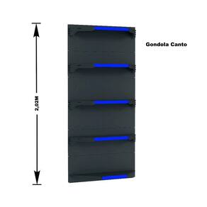 GONDOLA PAREDE 202 FIT AMAPÁ PARA VÃO DE ATÉ 5 METROS MAIS UM CANTO 40/30 PRETO 30 BANDEJAS PORTA ETIQUETA AZUL