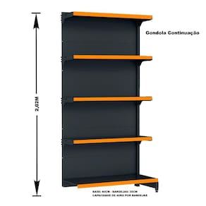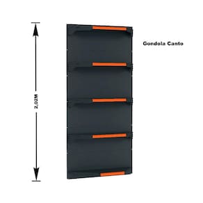 GONDOLA PAREDE 202 FIT AMAPÁ PARA VÃO DE ATÉ 5 METROS MAIS UM CANTO 40/30 PRETO 30 BANDEJAS PORTA ETIQUETA LARANJA