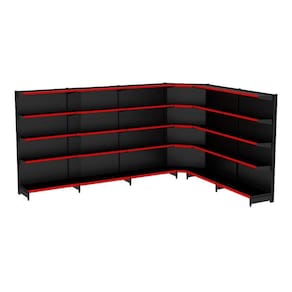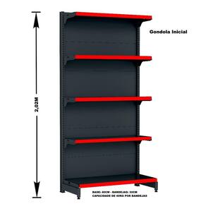 GONDOLA PAREDE 202 FIT AMAPÁ PARA VÃO DE ATÉ 5 METROS MAIS UM CANTO 40/30 PRETO 30 BANDEJAS PORTA ETIQUETA VERMELHO