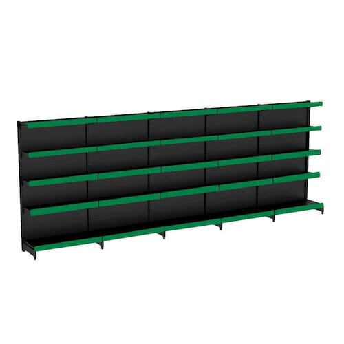 GÔNDOLA PAREDE 202 FIT AMAPÁ PARA VÃO DE ATÉ 5 METROS 40/30 PRETO 25 BANDEJAS PORTA ETIQUETA VERDE