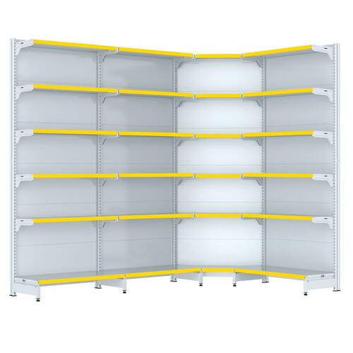 KIT GONDOLA PAREDE 202 CM FIT FARMÁCIA PARA VÃO DE ATÉ 3 METROS MAIS 1 CANTO 30/25 BRANCO 24 BANDEJAS PORTA ETIQUETA AMARELO