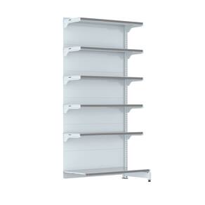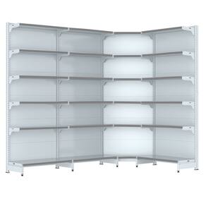 KIT GONDOLA PAREDE 202 CM FIT FARMÁCIA PARA VÃO DE ATÉ 3 METROS MAIS 1 CANTO 30/25 BRANCO 24 BANDEJAS PORTA ETIQUETA CINZA
