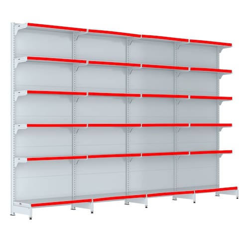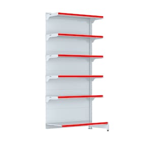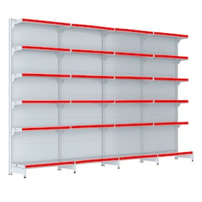 KIT GONDOLA PAREDE 202 CM FIT FARMÁCIA PARA VÃO DE ATÉ 4 METROS 30/25 BRANCO 24 BANDEJAS PORTA ETIQUETA VERMELHO