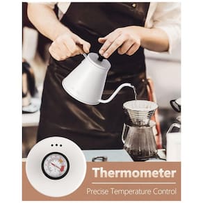 DESIGN ÚNICO DE BASE DE TRÊS CAMADAS Em comparação com outras chaleiras de café que têm apenas uma ou duas camadas de metal na parte inferior, nossa chaleira tem um design exclusivo de base de três camadas para manter sua chaleira livre de vazamentos e sem ferrugem por anos , que pode fornecer circulação de calor uniforme e ebulição rápida, que preserva mais o calor do que um pote de base de camada única. TERMÔMETRO INTEGRADO Para um sabor excepcional de café e chá, você precisa do melhor termômetro que puder. O fluxo de água suave é essencial para fazer café por gotejamento e despejar sobre o chá. O radiano de 90 pode ajudá lo a controlar com precisão a velocidade do fluxo de água para obter um vazamento preciso. PUNHO DE RESINA ANTI QUENTE RESISTENTE E ERGONÔMICO Este design estético e ergonômico da chaleira adota alça de resina resistente ao calor e um tapete de isolamento térmico adicional, permite que você segure a chaleira de café com as mãos sem risco de queimaduras. A forma ergonômica torna você mais confortável ao levantar, despejar e encher a água, garantindo que a cafeteira não escorregue. O design exclusivo de padrão de madeira da alça decora sua cozinha. DE USAR Esta chaleira de café usa materiais profissionais de qualidade alimentar e tecnologia de aço inoxidável 304, que é livre de ferrugem, fácil de limpar e rápida de aquecer. Livre de BPA. Mantenha e lave com cuidado e você sempre terá um fundo liso Esta chaleira de fogão é adequada para fogões a gás, elétricos, de indução, halogênio e radiantes. As chaleiras podem conter 1,1 litros , 37 onças de água, é melhor adicionar ao nível máximo de água no MAX da chaleira