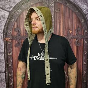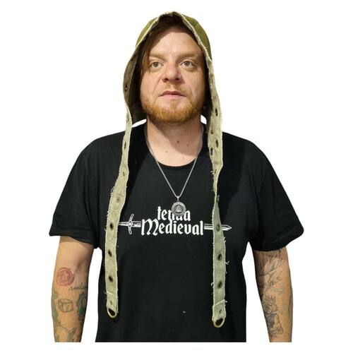 Este Gorro Medieval Duas Cores em Suede Scuba, nas tonalidades verde e cinza, combina estilo histórico e sofisticação. Com ilhoses decorativos e design longo, é o acessório perfeito para quem busca autenticidade e elegância.