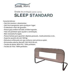 A Grade de Proteção Sleep Sênior é um equipamento projetado para garantir a segurança e o conforto de idosos durante o sono. Este produto é especialmente desenvolvido para ser instalado em camas, funcionando como uma barreira eficaz para prevenir quedas acidentais. Aqui estão algumas características e benefícios detalhados deste produto: Design Robusto e Seguro: Fabricada com materiais de alta qualidade, como aço reforçado ou alumínio, a grade oferece uma estrutura estável e durável. O acabamento é feito com revestimentos resistentes à corrosão, garantindo longevidade e fácil manutenção. Instalação Fácil: A instalação é simples e não requer ferramentas complexas, podendo ser facilmente montada e desmontada. A grade é compatível com a maioria das camas, adaptando-se a diferentes tamanhos e estilos de colchões. Conforto e Acessibilidade: O design ergonômico da Grade de Proteção Sleep Sênior permite acesso fácil à cama, com mecanismos de dobradiça que facilitam o abaixar e levantar da grade. Isso é especialmente útil para cuidadores ou para idosos que ainda possuem alguma mobilidade. Ajustabilidade: Possui opções de ajuste de altura para acomodar colchões de diferentes espessuras, garantindo que a grade fique sempre na posição ideal para a segurança do usuário. Características de Segurança Adicional: Inclui travas de segurança que previnem o desencaixe acidental, além de pontas arredondadas para evitar lesões. Algumas versões oferecem cintos de segurança adicionais para fixação extra. Estética Agradável: O design moderno e discreto da grade integra-se facilmente à decoração do quarto, mantendo a harmonia visual sem comprometer a segurança. Este produto é uma solução ideal para promover a independência e tranquilidade dos idosos e seus familiares, proporcionando um ambiente seguro para o descanso. Projetada especialmente para adultos, a Grade de Proteção pode ser Utilizado em qualquer modelo de cama para prevenir quedas e acidentes. Além disso, a Grade Sleep Sênior tem fácil montagem, pode ser transportada para qualquer lugar e suporta até 120kg. de segurança e tranquilidade. - Previne quedas. - Pode ser Utilizado em qualquer cama. - Fácil de montar e desmontar. - Fácil de transportar para qualquer lugar. - É dobrável e fácil de guardar. - Possui grip emborrachado antiderrapante. - Tela em poliéster para ajudar a ventilação. - Não necessita furação; - Possui bolsos para guardar objetos pessoais, medicamentos e etc. - Suporta usuário de até 120 Kg. - Estrutura reforçada em aço carbono com pintura epóxi. - Dimensões aberta AxLxP : 54 X 94 X 60 cm. - Tecido do bolso: 80% PVC / 20% poliéster. - Tecido da Tela: 100% poliéster. Marca: Não Informado