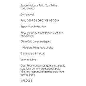 Descrição do produto Grade farol milha moldura palio 2004 05 à 2010 lad Mais informações Marca: 67781 Descrição completa Grade farol milha moldura palio 2004 05 à 2010 lado direito Grade moldura palio com milha lado direito Compatível: Palio 2004 05 06 07 08 09 2010 Especificação técnica: Peça elaborada com plástico de alta resistência. Conteúdo da embalagem: 1 -moldura milha lado direito de 3 meses Valor unitário Obs: recomendamos que a instalação seja feita por um profissional, pois não nos responsabilizamos pelo mau uso da peça. Mps0056 Agradecemos a sua visita Marca: Não Informado