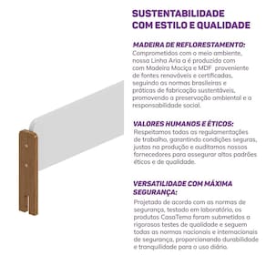 A peça mantém o charme e a integridade do design da Linha Aria, sendo confeccionada em madeira maciça de pinus com acabamento em verniz fosco nogueira. Isso assegura a robustez e a Qualidade e Durabilidade do móvel.