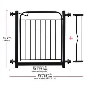 Observações Iniciais: Você pode utilizar o portão em duas opções de vãos: - Portão sem extensor: 69 cm à 73 cm - Portão com o extensor de 10 cm: 79 cm à 83 cm Indicado para: cães de pequeno, médio porte, e também para crianças. Não possui cantos vivos na estrutura o que promove mais segurança a seu bebe. Características Gerais: - Estrutura tubular reforçada; - Pintura com tinta epóxi a pó; - Instalação rápida e MUITO FÁCIL sem danos às paredes e sem furos; - Trava se segurança (evita que seu bebê ou cão abra com facilidade); - Abre para Ambos os Lados. Dimensões do Produto: - Altura 69 cm; - Largura:84 cm Sem Extensor (69 a 73cm) Com Extensor (79 a 83cm) - Distância entre as grades: 5 cm.