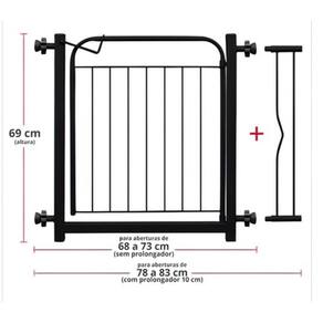 Você pode utilizar o portão em duas opções de vãos: - Portão sem extensor: 69 cm à 74 cm - Portão com o extensor de 10 cm: 79 cm à 84 cm Indicado para: cães de pequeno, médio porte, e também para crianças. Não possui cantos vivos na estrutura o que promove mais segurança a seu bebe. Características Gerais: - Estrutura tubular reforçada; - Pintura com tinta epóxi a pó; - Instalação rápida e MUITO FÁCIL sem danos às paredes e sem furos; - Trava se segurança evita que seu bebê ou cão abra com facilidade ; - Abre para Ambos os Lados. Dimensões do Produto: - Altura 69 cm; - Largura:84 cm Sem Extensor 69 a 74cm Com Extensor 79 a 84cm - Distância entre as grades: 5 cm.