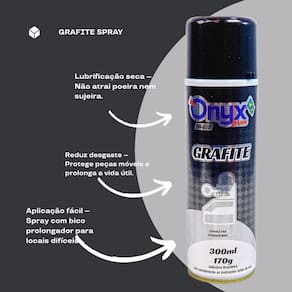 O Grafite Seco Spray 300ml da Onyx Plus é um lubrificante desenvolvido para aplicações onde a presença de óleos ou graxas não é desejada. Sua formulação permite a formação de uma película seca de grafite, proporcionando lubrificação eficaz e duradoura. Características Principais Lubrificação a Seco: Ideal para ambientes onde a umidade de óleos ou graxas é indesejável. Alta : O grafite micro pulverizado penetra nos poros das superfícies, reduzindo o desgaste e o esforço nos movimentos. Aplicações Diversas: Recomendado para canaletas de vidros de automóveis, antenas elétricas, correntes expostas à poeira, fechaduras, trincos e travas, especialmente em condições úmidas. Composição: Grafite, butano e propano como propelente. Modo de Uso: Agite bem antes de usar e aplique em quantidade adequada nos pontos sujeitos a atrito. Para áreas de difícil acesso, utilize o prolongador. Precauções: Evite o uso prolongado para prevenir congelamento e queimaduras nos dedos. Mantenha afastado de calor, faíscas e superfícies quentes. Não exponha a temperaturas superiores a 50C. Benefícios Desempenho Duradouro: Proporciona lubrificação de alta performance com ação duradoura. Proteção Contra Desgaste: Evita o ressecamento e o desgaste das peças lubrificadas, aumentando sua durabilidade. Marca: Não Informado Ean: 7898507096106