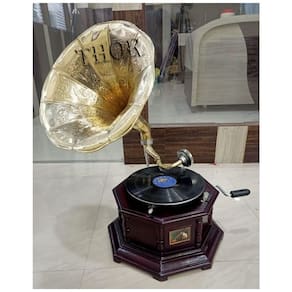 Acessório de música elegante para estúdio ou sala de estar, projetado exclusivamente para edição limitada. Tamanho 35,56 centímetros x 35,56 centímetros x 60,96 centímetros. Acabamento em latão e base de madeira marrom. Feito de latão e madeira de alta qualidade. Apresentando o elegante Gramofone Toca Discos Retrô com Trompa de Latão, da renomada marca THOR INSTRUMENTS. Este é um verdadeiro deleite para os amantes de música clássica e admiradores de designs vintage.