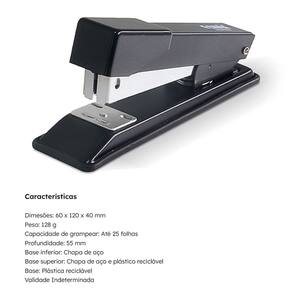 Produzido a partir de tecnologia moderna e matéria-prima de qualidade, possui capacidade para grampear até 25 folhas, ocorrendo variações de acordo com a gramatura do papel ou do grampo escolhido.