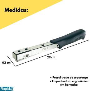 Grampeador Martelo R-19 - Rapid Ideal para aplicações ágeis e precisas, compacto e ergonômico, perfeito para uso com uma só mão. Indicado para a fixação rápida de etiquetas, cartazes, tecidos e outros materiais leves, oferece segurança e praticidade no manuseio.