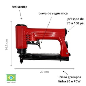 Especificações: Altura: 142 mm Comprimento: 200 mm Largura: 40 mm Peso: 0,89 kg Capacidade: 140 grampos Pressão de trabalho min : 70 psi Pressão de trabalho máx : 100 psi Consumo de ar: 0,5 l/golpe