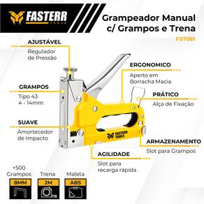 O Grampeador de Tapeceiro Fasterr FST081 é a ferramenta ideal para quem busca precisão, praticidade e eficiência em aplicações de tapeçaria, estofados, molduras e decorações. Leve, robusto e com ajustes precisos, ele garante performance em cada disparo.