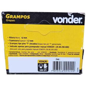 Grampo Pino VT 12 mm para Grampeador Manual 1.20 x 1.05mm 1.000 Unidades Vonder. - Marca: Vonder; - Referência: 28.98.612.000; - Altura do grampo: 12 mm; - Largura do grampo: 1,20 mm; - Medidas do arame: 1,05 mm; - Caixa com 1.000 grampos - Material do grampo: aço carbono - Tipo do grampo: Pino T - Possui acabamento zincado, proporcionando maior resistência à oxidação/corrosão - : 90 dias Indicado para o grampeador/pinador VONDER PLUS código 28.98.200.000. Os Pinos VT de 12 mm da Vonder são ideais para fixar materiais diversos, como tecidos, papéis, plásticos, madeiras e outros tipos de materiais. Se você trabalha com estofados, móveis, artesanato, construção civil, telas ou outras atividades que exigem uma fixação resistente e durável, esses grampos são uma excelente escolha. Com medidas precisas de 11,4 x 1,2mm, o Grampo Reto Vonder é fabricado em aço carbono com acabamento zincado, garantindo a sua durabilidade e resistência à oxidação e corrosão. Não perca mais tempo com grampos de baixa qualidade. Adquira agora os Grampos Retos Vonder de 10mm e tenha a tranquilidade de trabalhar com um produto de qualidade e resistência comprovadas. Economize muito no adicionando mais itens da loja ao seu carrinho - Leia toda a descrição e sintase a vontade de tirar suas dúvidas antes de comprar. - Precisa de um orçamento completo Nos mande sua lista completa por aqui que teremos o prazer de indicar ou montar um anúncio para atender a sua demanda com perfeição. Aguardamos seu pedido Muito Obrigado Marca: Não Informado