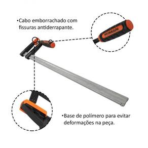 Com uma abertura máxima de 500 mm, esse grampo é ideal para segurar peças grandes e pesadas com facilidade. Sua altura de 12,5 cm, largura de 1,5 cm e comprimento de 58 cm garantem um tamanho compacto e fácil de usar em qualquer projeto.