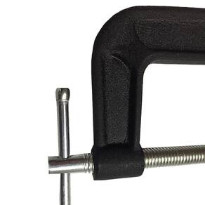 corpo de grampo tipo C e coberto de tinta em pó, resistente a danos mecânicos e que protege o grampo seguramente contra a corrosão. dentes tem placas especiais para evitar deformação de peças em processamento. parafuso de grampo com cabo T fixa seguramente peças em processamento.