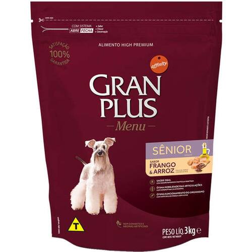 Ração Gran Plus Cães Adultos Sênior Raça Média Frango - 3kg- Saúde oral, com hexametafosfato de sódio, que auxilia na redução da formação do tártaro, e com partícula adaptada, que ajuda na preensão e mastigação do alimento; - Ótima mobilidade das articulações, com condroitina e glicosamina que auxiliam na manutenção das articulações do cão sênior; - Ótimo funcionamento do organismo, com fonte rica em ômega 3 (EPA & DHA): nutrientes essenciais; - Manutenção da saúde intestinal, com polpa de beterraba e pré-biótico MOS. Marca: Não Informado