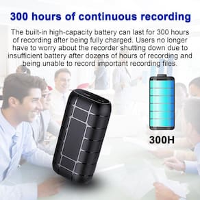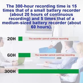 ?Longo tempo de bateria?O gravador de voz tem uma bateria embutida de grande capacidade, que pode gravar continuamente por 300 horas após ser totalmente carregada.