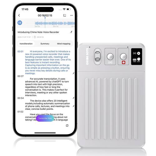 Gravador de voz AI que transcreve em 107 idiomas, com sincronização entre aplicativo e web, pasta personalizada, carregamento magnético sem fio e resumo instantâneo via ChatGPT-4o.1 - ??Sem taxa e sem limite de tempo para transcrição e resumo?: ao contrário de outros gravadores de voz AI no mercado, o gravador de voz CHIME NOTE AI não tem custo nem limite de tempo para transcrição inteligente e resumo! Você pode gravar e transcrever o quanto precisar sem se preocupar com taxas de assinatura ou restrições de uso. Economize pelo menos US$ 10 por mês para você!! ! - ??Aplicativo ChimeNote e sincronização WEB e pasta personalizada?: Sincronize suas gravações sem esforço entre o aplicativo e a web, garantindo acesso aos seus arquivos a qualquer hora, em qualquer lugar. - A função de pasta personalizada permite que você use e organize seus arquivos de gravação exatamente como você quiser. O gravador de voz AI ajuda seu trabalho a permanecer eficiente, organizado e sempre sincronizado. - ??Suporta 107 idiomas e carregamento magnético sem fio?: O gravador de voz CHIME NOTE AI suporta transcrição e resumo em 107 idiomas. Se você estiver trabalhando com inglês, espanhol, chinês ou outros idiomas, o dispositivo gravador garante transcrições e resumos precisos. É equipado com uma bateria de 3000 mAh que suporta carregamento magnético sem fio, tornando incrivelmente fácil recarregar seu dispositivo. - ??Privacidade e segurança de dados?: A CHIME NOTE prioriza sua privacidade primeiro, oferecendo armazenamento seguro na nuvem e proteção de dados criptografados, garantindo que seus arquivos sejam criptografados e acessíveis apenas por você. Suas gravações e transcrições são armazenadas com segurança e você tem controle total sobre o acesso aos seus dados. Você pode acessar seus arquivos de qualquer dispositivo, baixá-los ou compartilhá-los com outras pessoas, sabendo que suas informações são mantidas seguras e privadas. - ??Transcrição automática?: diga adeus às anotações manuais. Este gravador de voz AI e anotador permite que você converta suas gravações de áudio em texto sem esforço, economizando tempo e esforço, esteja você gravando uma reunião, uma palestra ou um memorando pessoal. E durante gravações longas, o gravador salva automaticamente cada segmento de 1 hora e continua gravando até você pará-lo. Certifique-se de que você está usando a versão mais recente do aplicativo. - ??Resumo instantâneo?: o gravador de voz CHIME NOTE oferece resumo em tempo real de suas gravações, alimentado por ChatGPT-4o. Este recurso extrai rapidamente pontos-chave e fornece resumos concisos e bem organizados de suas conversas ou eventos; você pode obter uma visão geral clara sem filtrar transcrições longas. É ideal para profissionais ocupados que precisam de uma visão geral rápida das reuniões ou estudantes que desejam se concentrar nas principais ideias em palestras. - ??Gravador de voz AI CHIME NOTE?: O gravador de voz AI CHIME NOTE integra-se perfeitamente com a colaboração ChatGPT-4o, um modelo líder de linguagem AI. Esta colaboração permite a transcrição altamente precisa e inteligente de áudio em texto. Se você estiver gravando uma reunião, palestra, entrevista ou sessão de brainstorming, o CHIME NOTE transforma instantaneamente suas palavras faladas em texto escrito com precisão incomparável. Este gravador de áudio inteligente melhorou muito a eficiência do seu trabalho diário. - ??Amplo uso?: é amplamente utilizado em vários cenários, como chamadas, reuniões, palestras, conferências, seminários, sessões de estudo, ensino de professores, pesquisa, consultas de pacientes, transcrição de notas médicas, captação de discussões durante conferências médicas ou diário de escrita de voz e assim por diante. - ??Perfeito para todas as pessoas?: perfeito para profissionais de negócios, estudantes, educadores, jornalistas, escritores, criadores de conteúdo, podcasters, produtores de vídeo, médicos, advogados, estudantes de idiomas, pesquisadores, profissionais de saúde, conselheiros cardíacos e muito mais!