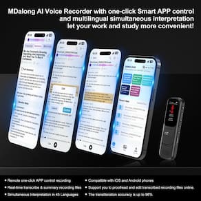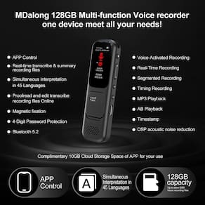 IMPORTANTE: Se for um produto elétrico, ele pode ser compatível com uma tomada de 110 volts. Se utilizado fora dos Estados Unidos, pode ser necessário um conversor de voltagem para garantir a operação adequada. Verifique se o produto que você está comprando é elétrico antes de considerar essas informações. O gravador de voz magnético MDAlong de 128 GB (9360 horas) de 3072 kbps com controle de APP permite que você transcreva e resuma sua gravação com um clique, a tradução simultânea em 45 idiomas está disponível e também permite que você edite e revise os arquivos de transcrição on-line via APP. Este gravador de voz pode oferecer uma função mais abrangente, para permitir que seu trabalho seja mais eficiente. Você nunca precisa se preocupar em fazer atas de reuniões e anotações de aula. Existem 2 maneiras de usar este gravador de voz: 1. Conecte-se ao aplicativo para usar este gravador de voz. Depois de conectar seu gravador de voz ao aplicativo, este dispositivo de gravação permite que você use o aplicativo para controlar a gravação com um clique, permite que você transcreva e resuma livremente sua gravação de áudio e também permite editar e revisar o arquivo transcrito on-line. Enquanto isso, este aplicativo também vem com tradução simultânea em 45 idiomas. 2. Use este gravador de voz sozinho sem o aplicativo: este gravador de voz também permite que você o use sozinho sem o aplicativo, ele pode oferecer vários modos de gravação e vários cenários de gravação. Você encontrará mais surpresas neste gravador de áudio, este gravador o entenderá melhor. 3. Vários modos de gravação: gravação ativada por voz, gravação em tempo real, gravação segmentada e gravação temporizada, etc. Vários cenários de uso de gravação: entrevista, reunião, estação, ensino, etc. 4.Built-in Alto-falante HiFi: suporte para som externo. Equipado com sistema de redução de ruído acústico DSP: separa automaticamente o ruído, proporcionando um som mais realista e claro, este gravador pode oferecer qualidade de som de gravação HD de 3072 kbps. 5. Bluetooth 5.2: permite que você clique rapidamente no APP ou conecte-se a outro dispositivo Bluetooth, como: fone de ouvido Bluetooth, áudio Bluetooth, áudio do carro, etc. 6. Grande capacidade: o gravador vem com 128 GB de memória, permite que você armazene mais de 9360 horas de arquivos de gravação. E depois de se conectar ao APP, você também pode obter o espaço de armazenamento em disco na nuvem de 10 GB de APP. Nota: Se o seu gravador solicitar um erro de disco, formate seu disco no formato FAT32 - 📲 Controle de um clique do APP: o gravador de voz magnético MDalong com APP permite que você controle o gravador de voz via APP e também permite que você transcreva e resuma sua gravação, mas também permite que você edite e revise livremente os arquivos de transcrição on-line. Enquanto isso, este gravador de voz também pode fornecer interpretação simultânea em 45 idiomas, permitindo que seu trabalho e estudo sejam mais eficientes. - 🚩 Gravador tudo-em-um: este gravador de voz multifuncional também pode ser utilizado sozinho sem o APP, tornando seu uso mais conveniente. Este gravador de voz também oferece mais modos de gravação múltiplos e vários cenários de uso de gravação para sua escolha, como gravação ativada por voz, gravação segmentada, gravação em tempo real, gravação cronometrada, entrevista, reunião, estação, ensino, etc. Você pode encontrar o modo de gravação mais adequado neste gravador de voz. - 🔊 Qualidade de som HD de 3072 kbps: este gravador de voz AI possui alto-falante embutido, permitindo que você ouça a gravação sem fone de ouvido. Enquanto isso, este gravador de áudio também adotou o design de captador de microfone duplo e está equipado com o sistema de redução de ruído acústico DSP, que pode gravar com precisão a fonte de som e separar automaticamente o ruído, para trazer um som autêntico mais claro e realista. A qualidade de som de gravação HD de 3072 kbps permite que você ouça cada palavra claramente neste gravador de áudio. - 🧲 Design de fixação magnética super forte: este gravador de voz inteligente adotou o design de fixação magnética, permite que você conecte facilmente seu dispositivo de gravação à mesa, carro, geladeira ou qualquer outro objeto de metal férrico, simples de operar e portátil. Este é um gravador de voz que entende você melhor. - 🔐 Proteção abrangente por senha: Este gravador de voz inteligente possui um sistema de proteção por senha de 4 dígitos integrado, você pode definir livremente uma senha de ativação de 4 dígitos para o seu gravador de voz, mais de 10.000 combinações de senhas apenas para oferecer a você um espaço criativo pessoal que pertence apenas a você, este gravador de voz nasceu apenas para você. Enquanto isso, para os arquivos do APP Cloud Drive, somente você tem o direito de acessá-los e compartilhá-los, todos os arquivos são processados por criptografia, cada usuário é um usuário VIP separado. - 🌈 Memória super grande: este gravador de voz portátil vem com 128 GB de grande capacidade, permite armazenar até 9360 horas de arquivos de gravação, você nunca precisa se preocupar com a capacidade do gravador de voz não ser suficiente. E depois de fazer login no aplicativo, você também pode obter um espaço adicional na nuvem de 10 GB para armazenar seus arquivos de gravação, permitindo que você possa transcrever e armazenar seus arquivos livremente, este dispositivo de gravação entende melhor suas necessidades. - 💡 Verifique o processo de gravação on-line em tempo real: ativar o modelo de gravação em tempo real deste gravador de áudio permite que você verifique a integridade das gravações on-line do início ao fim por meio do fone de ouvido com fio, evitando que o gravador de áudio apareça. As gravações em 