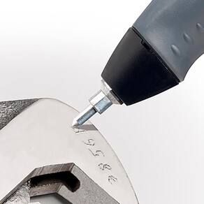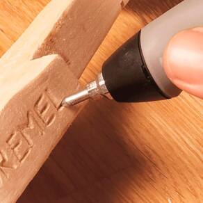 Ferramenta de gravar – Grava uma grande variedade de materiais com toda a precisão com um ótimo controle da profundidade O seletor de ajuste do golpe regula a profundidade de gravação desde linhas finas até ranhuras profundas O design leve e compacto proporciona uma utilização confortável para um desempenho de gravação de precisão O cabo Softgrip proporciona conforto e controle extra As pontas substituíveis de carbono permitem-lhe gravar na maioria das superfícies Este kit inclui um molde para gravar facilmente letras e números