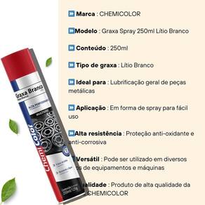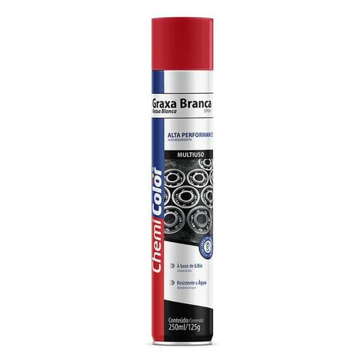 Graxa de Lítio Spray Branco 250ml - Chemicolor Detalhes do Produto Marca : CHEMICOLOR Modelo : Graxa Spray 250ml Lítio Branco Conteúdo : 250ml Tipo de graxa : Lítio Branco Ideal para : Lubrificação geral de peças metálicas Aplicação : Em forma de spray para fácil uso Alta resistência : Proteção anti-oxidante e anti-corrosiva Versátil : Pode ser utilizado em diversos tipos de equipamentos e máquinas Qualidade : Produto de alta qualidade da marca CHEMICOLOR
