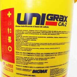 Produto Unigrax ca é uma graxa à base de cálcio, hidro-repelente, fabricada com óleo lubrificante de alta viscosidade, tendo uma cor castanho escura e grande adesividade. Recomendada para lubrificação das articulações de chassis de caminhões, automóveis, tratores, motocicletas, máquinas agrícolas, mancais de deslizamento e sempre que necessite de uma graxa para trabalhos em temperaturas não superiores a 70ºc. É também utilizada em indústrias pesadas, tais como mineração, laminação de aço e metais não ferrosos, manufatura de produtos químicos e usinagem de metais.