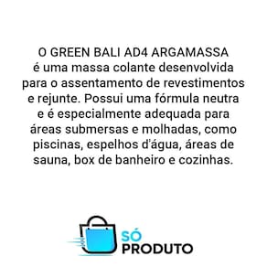 O green bali ad4 argamassa é uma massa colante desenvolvida para o assentamento de revestimentos e rejunte. Possui uma fórmula neutra e é especialmente adequada para áreas submersas e molhadas, como piscinas, espelhos d'água, áreas de sauna, box de banheiro e cozinhas. Além disso, oferece um relativo poder de acomodação às movimentações entre o revestimento e o substrato, distribuindo tensões e acompanhando a dilatação do material em que é aplicado.