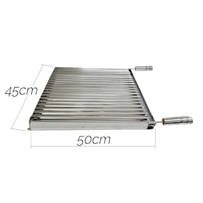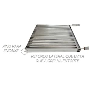 Fábrica em aço inox 430 de excelente qualidade e durabilidade. Estrutura reforçada em chapas de aço inox, soldadas à dois ferros maciços tarugos de 1/4 em inox 304 que ajudar a reforçar a grelha. Possui sistema de canaletas que ajudam a escoar a gordura das carnes até o reservatório o qual evita fumaças no churrasco e formação de labaredas de fogo atrapalhando o churrasco. Você pode pincelar a gordura que escoar até a canaleta na carne deixando mais suculenta e saborosa. Pode também acrescentar temperos na canaleta para que quando a gordura escoar fique temperada e ao pincelar na carne dará um sabor surpreendente.