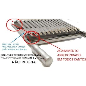 Qualidade: A qualidade dos nossos produtos são garantidos pela espessura e cantoneiras de até 3cm da estrutura que dão maior reforço e não entortam, partes da estrutura que chegam a 1,2mm de espessura, além das 3 travessas , isso faz grande diferença. As laterais são abertas para facilitar a limpeza, pois as fechadas acumulam a gordura ficando inviável a limpeza. Além de toda a grelha ter acabamento arredondado nas canaletas e todos os cantos e pontas possuem o mesmo acabamento para evitar que se machuquem ao manipular a grelha. Tem um ótimo angulando na parte superior elevando um lado da canaleta para que escoe a gordura ou o suco da carne ao coletor de gordura.