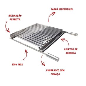 - Possui sistemas de canaletas inclinadas que recolhem a gordura em um reservatório evitando o excesso de gordura caia na brasa. O reservatório é removível para facilitar a limpeza