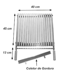 ESPECIFICAÇÕES TÉCNICAS: Largura: 40cm Profundidade útil do fogo: 40cm Profundidade útil+calha coletora: 45cm Profundidade total com cabos : 63cm Material: Aço inox 430 Canaletas são fixadas com 2 pontos de solda deixando mais resistente e durável.