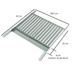 Possui sistema de canaletas que ajudam a escoar a gordura das carnes até o reservatório evitando o excesso de fumaça e a formação de labaredas.